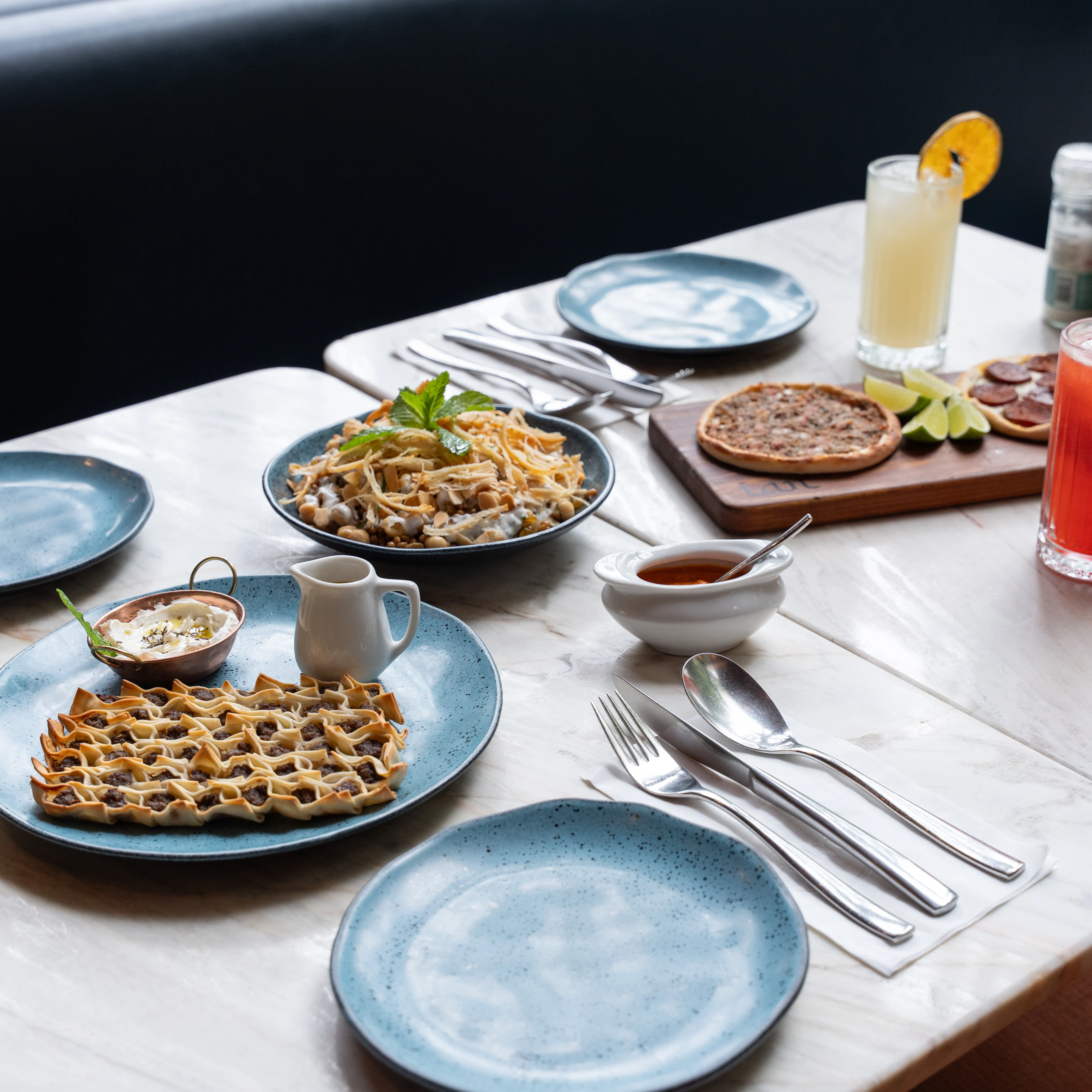 Quem quiser pegar mais leve, a salada de grãos (R$ 56), preparada com trigo grosso, grão-de-bico, uvas-passas, hortelã, amêndoas e frango desfiado ao molho de coalhada fresca, é ótima pedida. Na ala dos pratos quentes, vale pedir o matã de carne (R$ 65), uma das vedetes da casa. Trata-se de uma massa delicada em formato de colmeia, que chega à mesa com os pequenos casulos recheados com uma carne suavemente temperada. À parte, além do molho da carne incrementado com manteiga clarificada, vem um potinho de coalhada seca para adicionar a gosto.