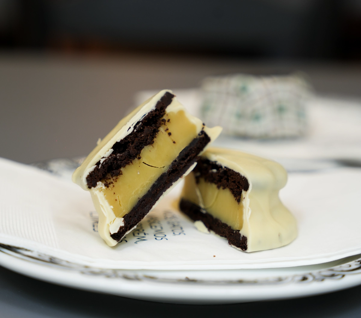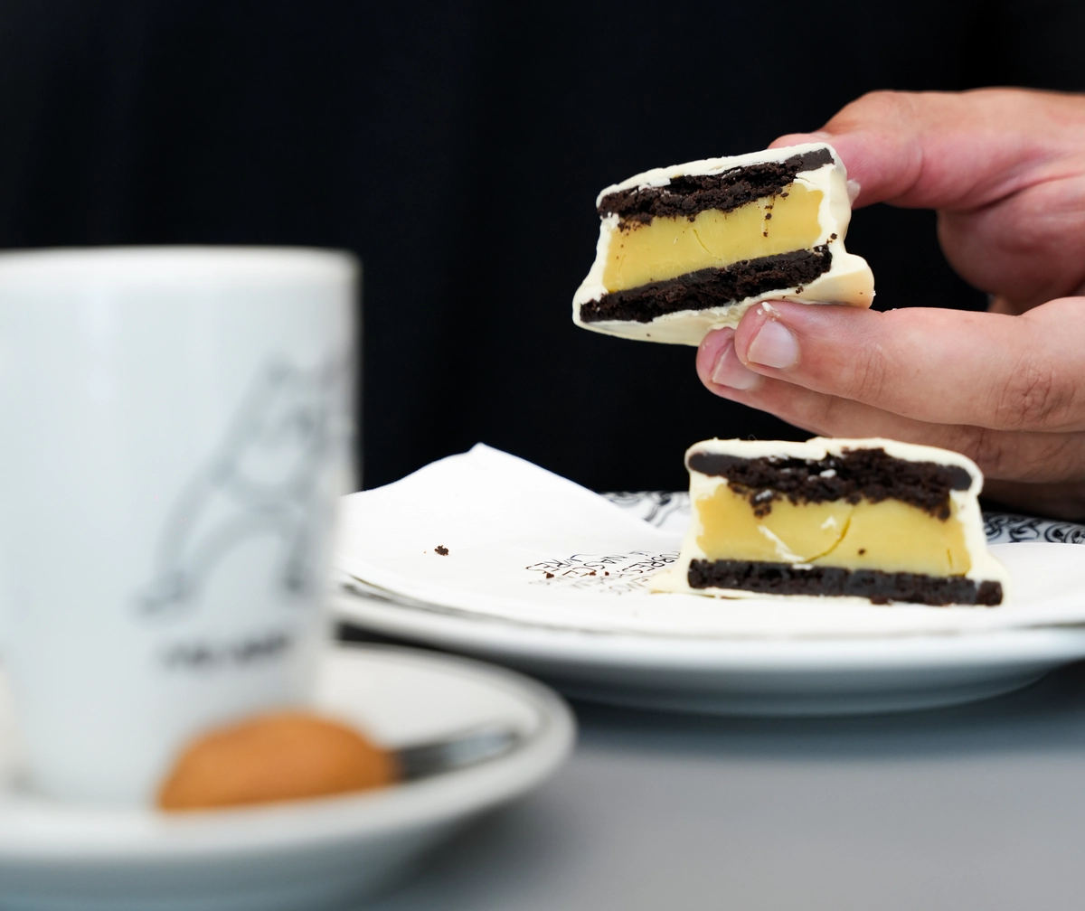 O biscoito Miado Maravilha (R$ 25), feito com cacau black e recheado com brigadeiro de capim-santo e chocolate branco, vem embrulhadinho em papel e pode ser levado para um docinho mais tarde do escritório.