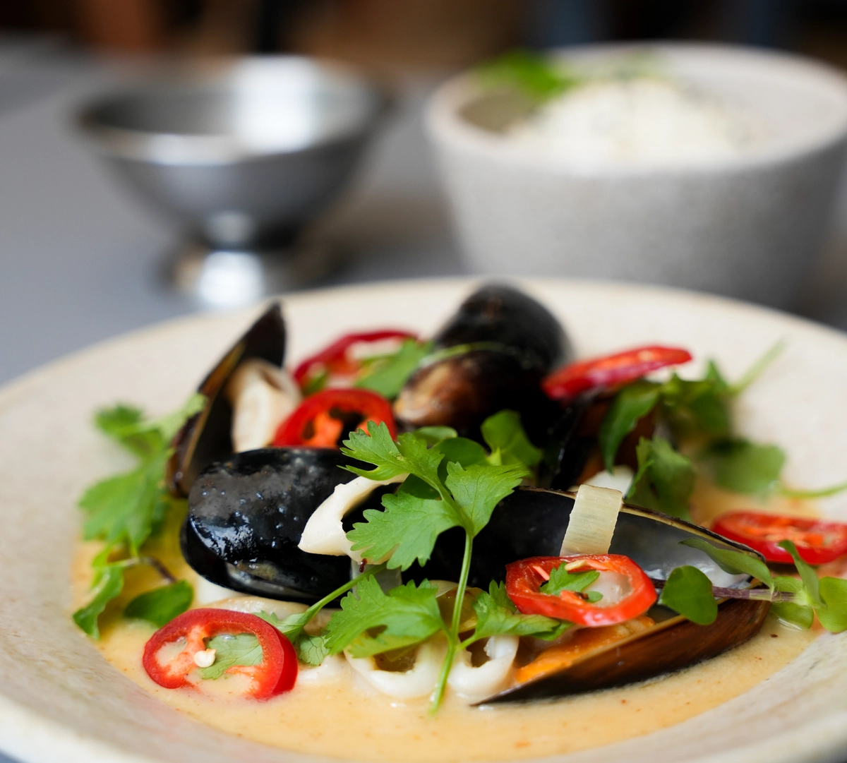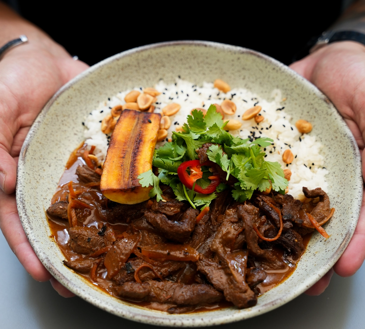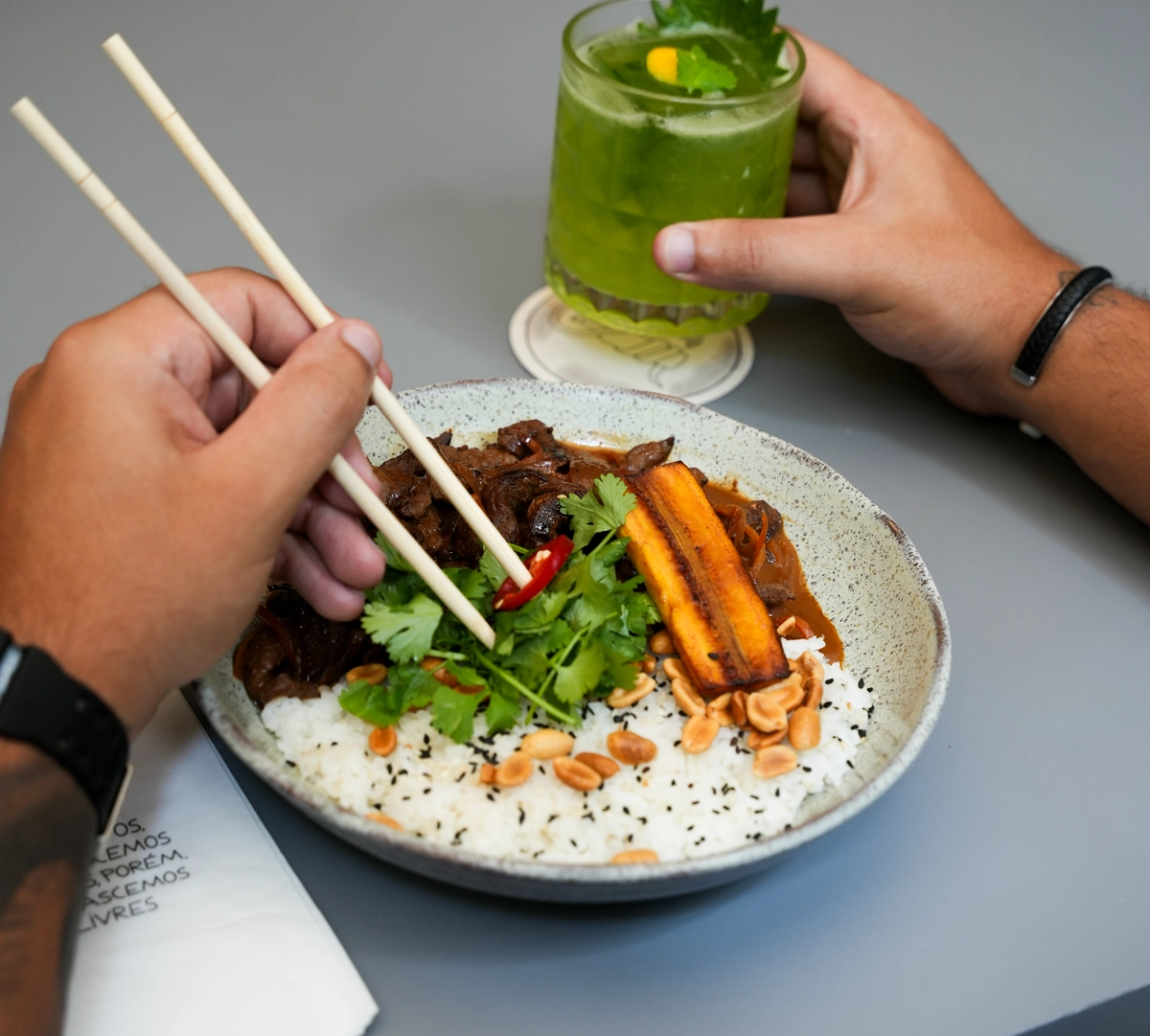 Entre os principais, o kampuchea, com tirinhas de carne no molho de curry vermelho (apimentado e levemente adocicado), gohan, banana tostada e amendoim; e o arroz frito com vegetais, ovo mexido, edamame, maionese de alho, ervas frescas e amendoim costumam dar as caras.