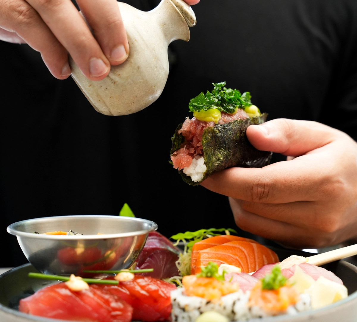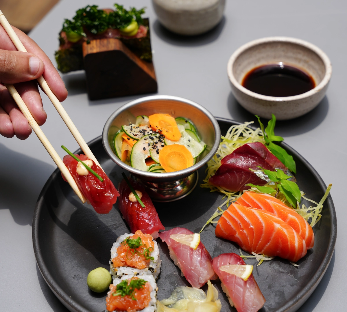 Quem estiver com vontade de comer comida japonesa, por mais R$ 22 pode arrematar o platô, item sazonal que inclui um temakinho aberto de atum, dois uramakis do dia, quatro sashimis do dia, quatro sushis do dia e uma saladinha.