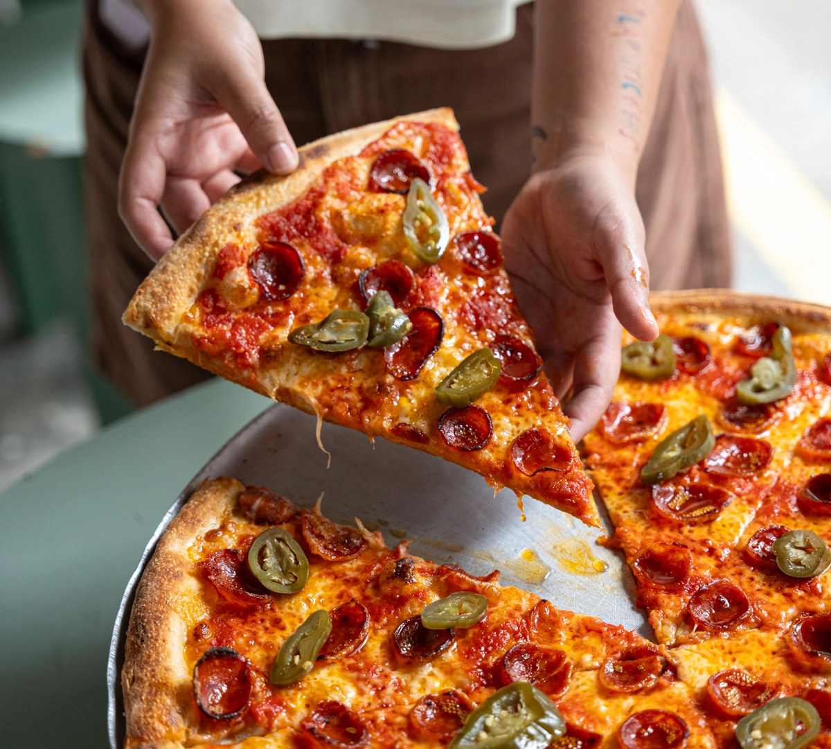 Servidas em pratos de papelão, elas aparecem em oito sabores, como as clássicas marguerita (molho de tomate, muçarela, manjericão e azeite, R$ 18 a fatia, R$ 128 a inteira) e pepperoni (molho de tomate, muçarela e pepperoni, R$ 20 a fatia, R$ 144 a inteira), e as “ame ou odeie” milho com creme de limão, muçarela, milho-doce, parmesão, manjericão e pimenta-do-reino (R$ 18 a fatia, R$ 140 a inteira), e frango (molho de tomate, muçarela, frango, cebola roxa e molho ranch e molho bbq, R$ 20 a fatia, R$ 144 a inteira).