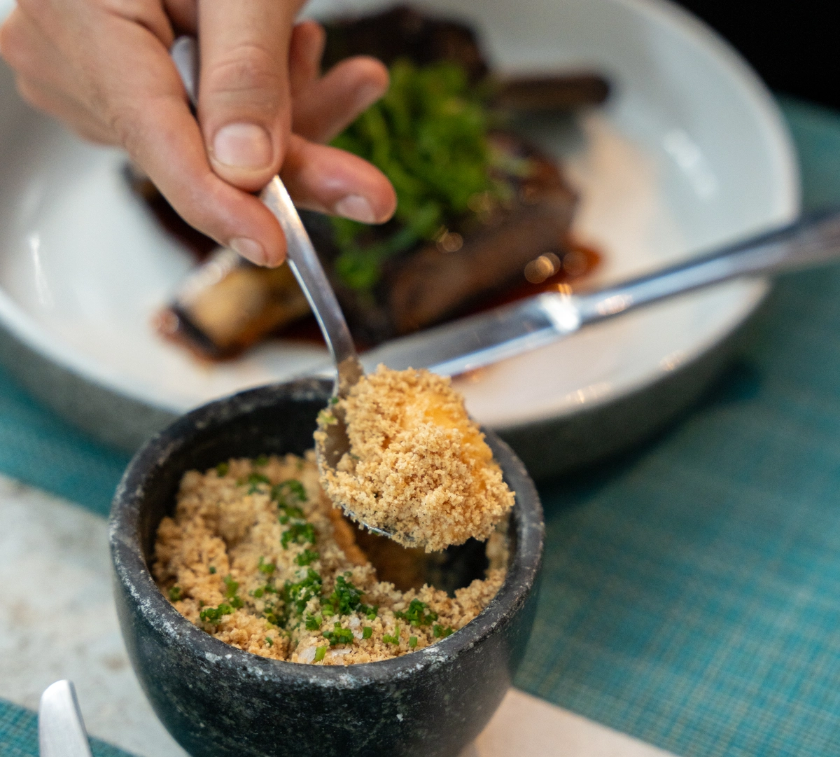 Já no menu corriqueiro, dá para começar com o tartare de atum com coalhada, pasta de tomate assado, azeite de manjericão e avelã (R$ 85), com a coxinha de galinha caipira com espuma de requeijão de corte defumado à parte e pimenta da casa (R$ 42, quatro unidades) ou com o milho na brasa com maionese de queijo Tulha, crocante de pão e pimenta togarashi (R$ 44). Entre os principais, a costela na brasa por 18h (R$ 140), incrementada com demi-glace e cebolinha, serve bem duas pessoas. Peça a salada de rúcula selvagem com emulsão de pistache, laranja e amêndoa (R$ 58) e a farofa de ovo mole (R$ 38) para acompanhar. De sobremesa, não saia sem provar “o” pudim (R$ 44).