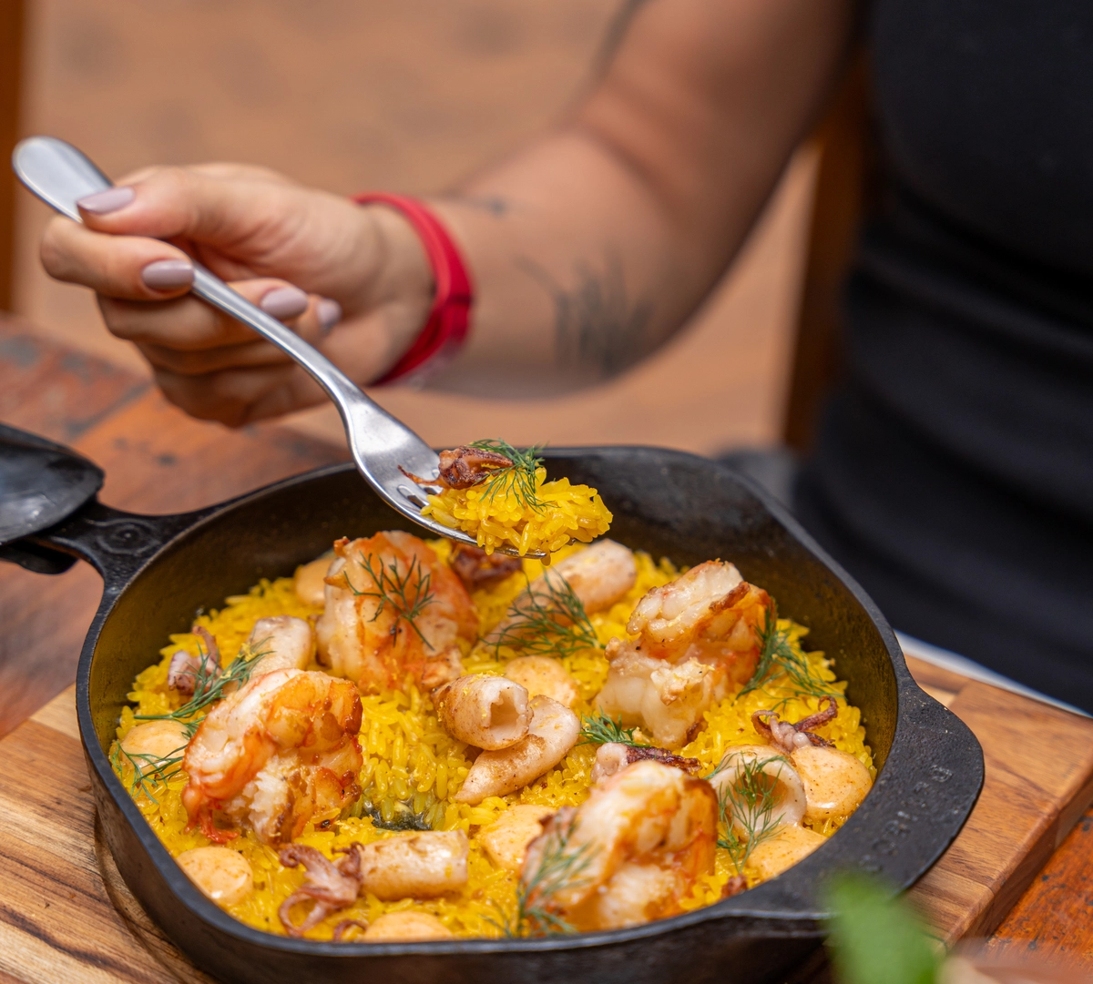 Quem preferir pode optar pelos pratos à la carte, como o pão-folha assado na lenha, com alcachofra, queijo da serra da Canastra, tomate assado, búfala fresca e rúcula (R$ 68), que abre alas para pedidas como o arroz no caldo do mar (R$ 143), com camarão, lula e peixe grelhado, azeite de coentro e maionese de limão-cravo, e o vitelo à milanesa na lenha (R$ 116), que pode ser acompanhado por purê de mandioquinha com manteiga de garrafa (R$ 35).
