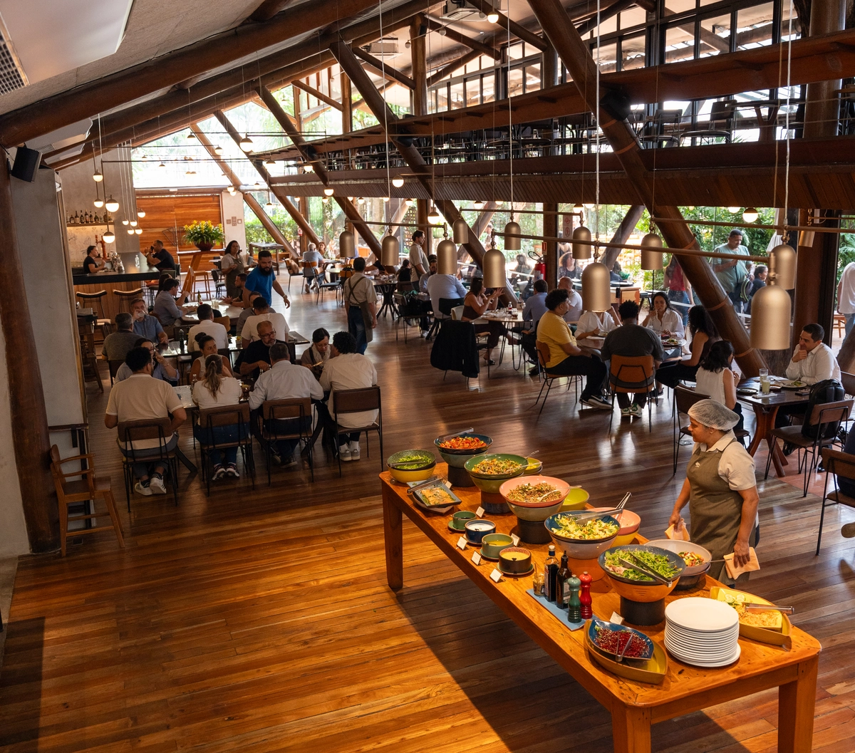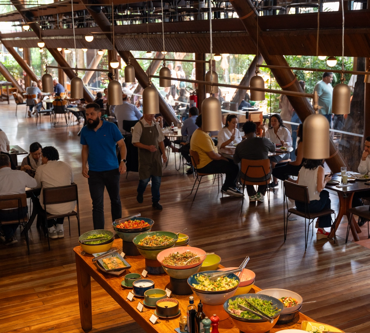 Por conta de sua baita área externa cercada por verde – com direito a um lago com carpas e casa na árvore para as crianças –, o restaurante é como um refúgio para famílias e grupos de executivos engravatados que buscam escapar, ainda que por uma hora, do caos urbano típico daquela região. Dá para escolher uma mesa nesse cenário (até mesmo nos dias de chuva, já que o teto é retrátil) ou sentar-se no salão interno, cuja vantagem é ficar mais perto do bufê.