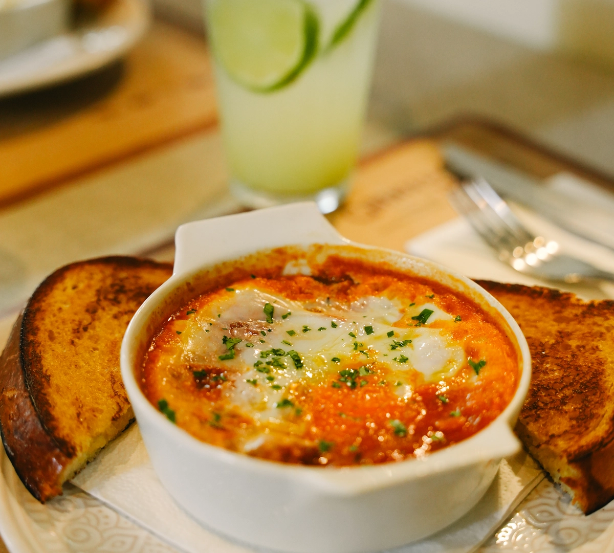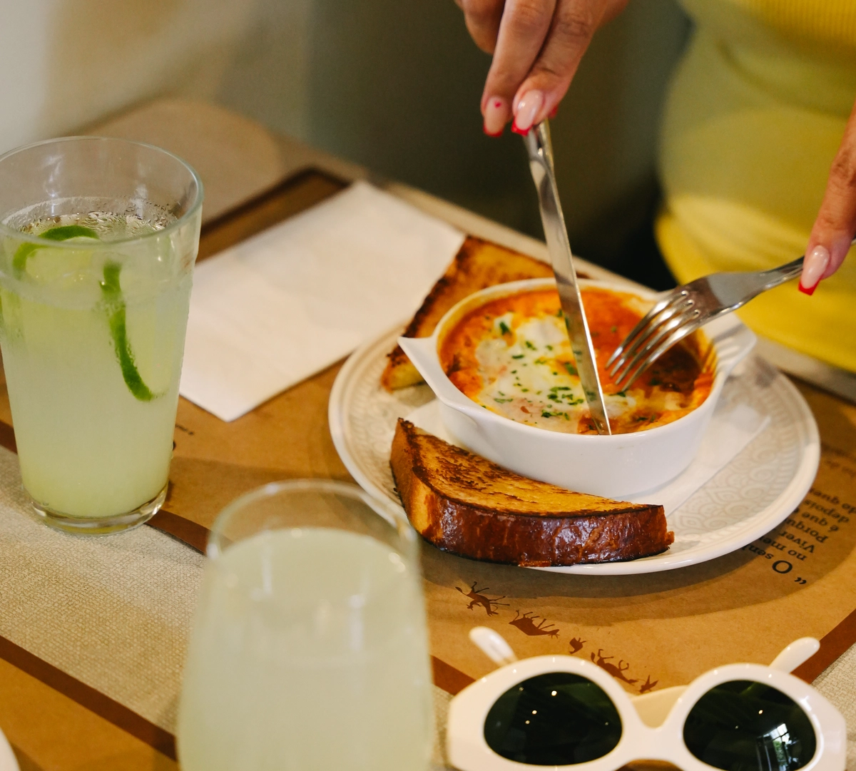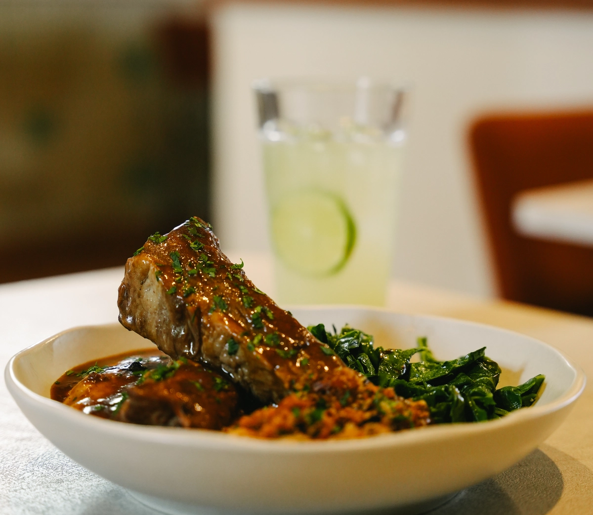 Para comer, a chef consultora Andreza Chê Biagioni sugere mineirices com toque autoral, como a salada Num é caesar (R$ 58), com alface, rosbife de porco da casa, tomate-cereja, parmesão mineiro, molho caesar e pururuca; a costelinha de porco Diadorim (R$ 87), com molho de café, purê e farofa de broa e couve refogada; e a galinhada do Paraíso (R$ 58), incrementada com pururuca, picles de maxixe com pequi e pimenta-de-cheiro.
