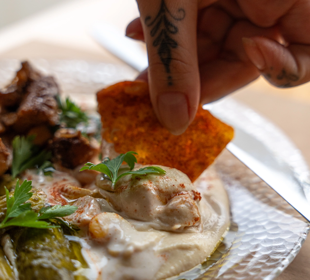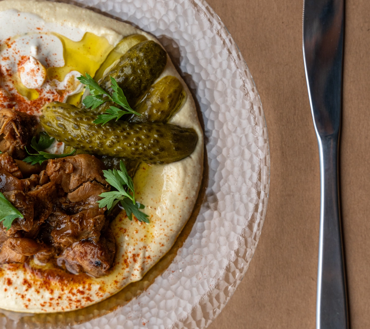 O homus no prato, com grão-de-bico, picles, zhug (molho de origem iemenita com ervas frescas e especiarias), molho de tahine e pão pita fresco e torrado, pode incluir falafel (R$ 59) ou shawarma (frango assado com especiarias; R$ 68).