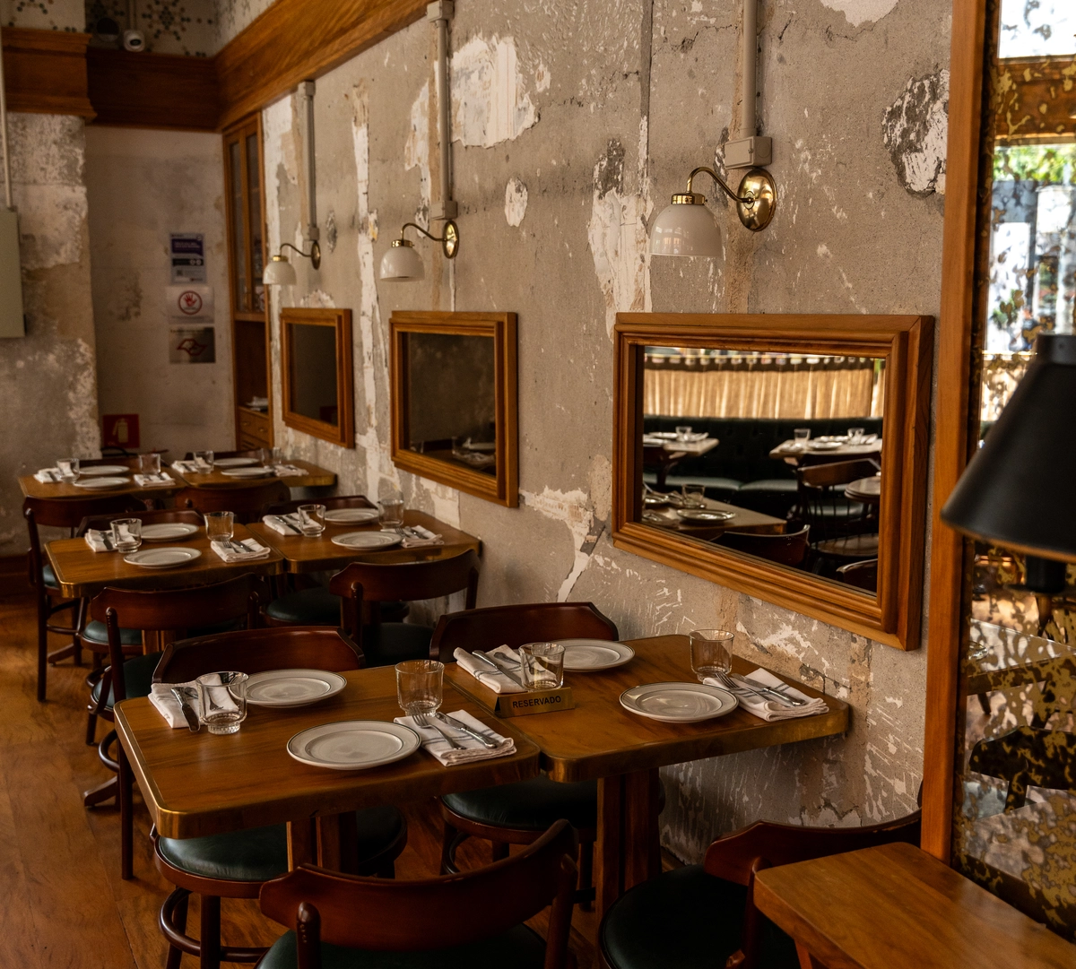 Mas vale mesmo a pena ficar no charmoso salão, com marcenaria de peroba rosa de demolição, móveis e luminárias garimpadas da Europa, paredes propositalmente descascadas e um espelho desgastado no teto. A maioria das mesas é voltada para duplas ou grupos de até quatro pessoas, mas até oito pessoas podem ser acomodadas com tranquilidade (de novo, se fizerem reserva).